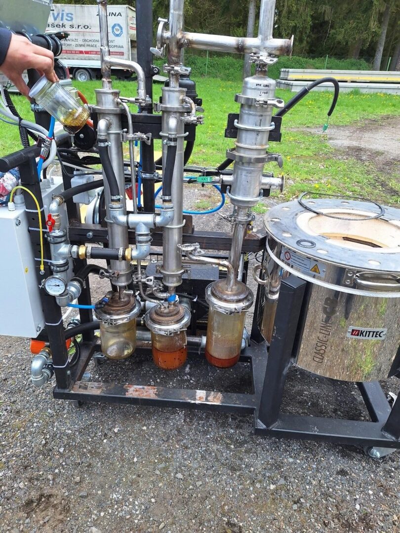 Vzhledem k tomu, že použití ať už univerzální nebo jednoúčelové jednotky, popsaných na jiném místě, je dosti nevhodné, protože by bylo potřeba několik metrických centů tohoto odpadu, rozhodli jsme se postavit malou termolýzním jednotku, tentokrát ne kontinuální ale dávkovací na cca 5 kg vstupního materiálu. Na výstupu máme stejně jako v případě větších jednotek plynou, tekutou i pevnou frakci, kterou můžeme podrobit chemické analýze a získat tak informace o kvalitě výstupních materiálů. Tato jednotka je na dalších obrázcích, má za sebou potřebné testy a je plně funkční. Případným zájemcům o testování jejich vlastního odpadu jsme schopni za úplatu tyto testy zajistit, a to i s následujícím chemickým rozborem.